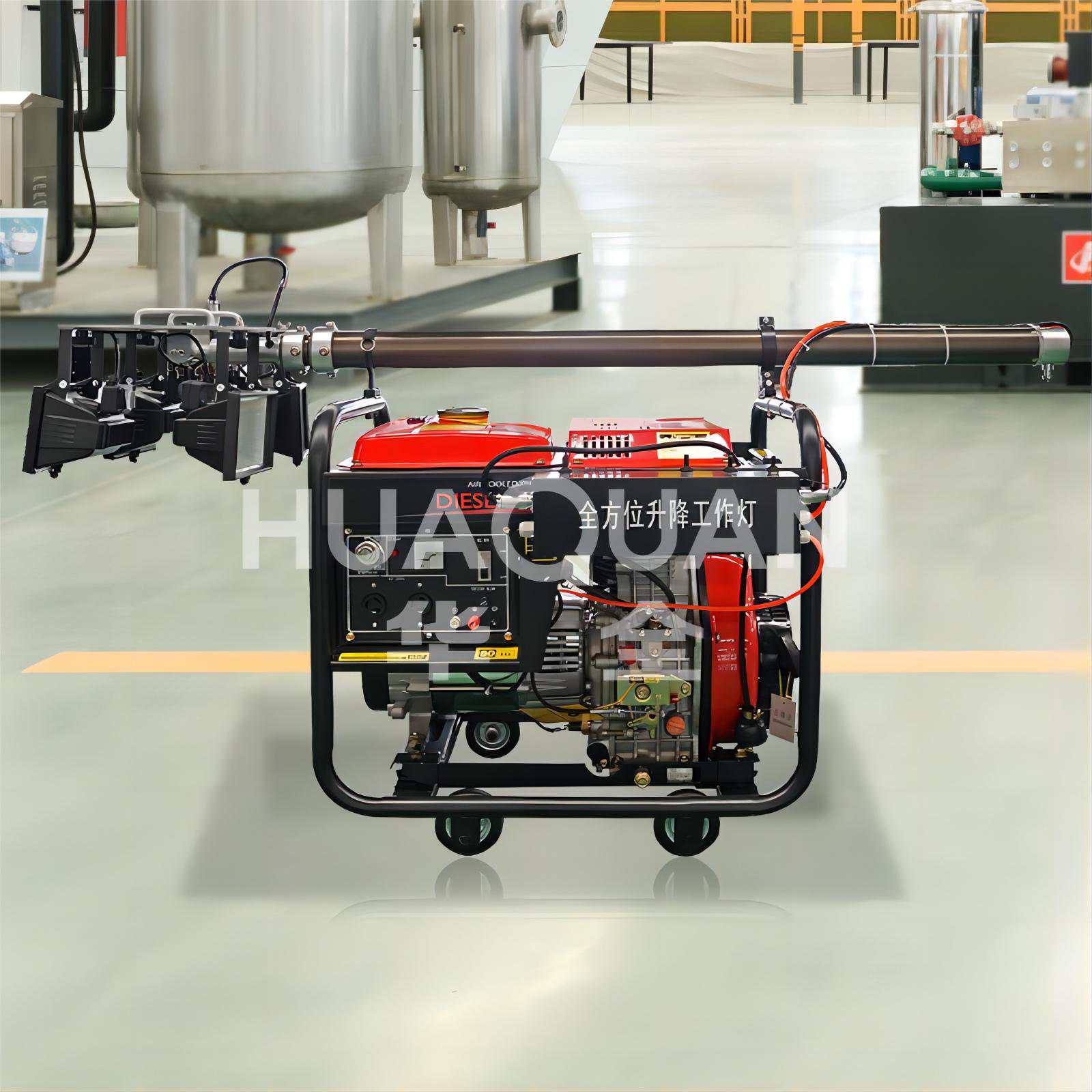 華全電力移動照明燈塔在大功率照明燈基礎(chǔ)上,為它搭配了10kW、5kW發(fā)電機組,用戶可以自由選擇用汽油還是用柴油發(fā)電。這批新西蘭客戶采購的機器,就是5kW的規(guī)格。