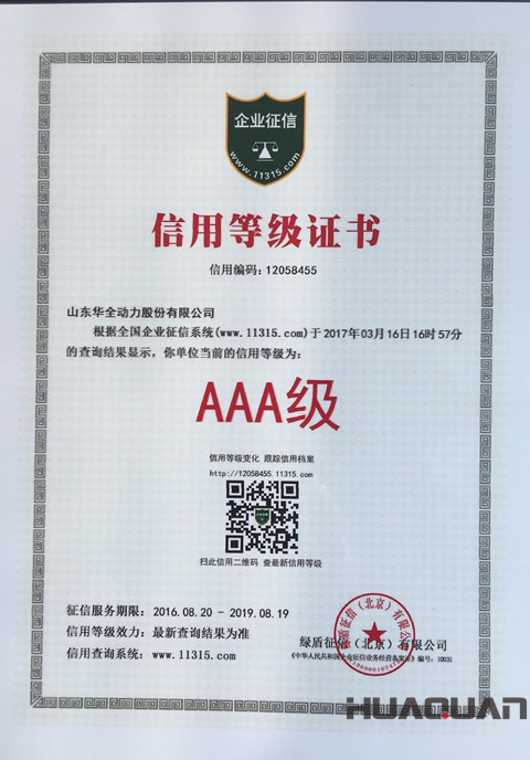3月27日,華全動力正式獲得了11315綠盾全國企業(yè)征信系統(tǒng)頒發(fā)的AAA級企業(yè)信用等級證書。